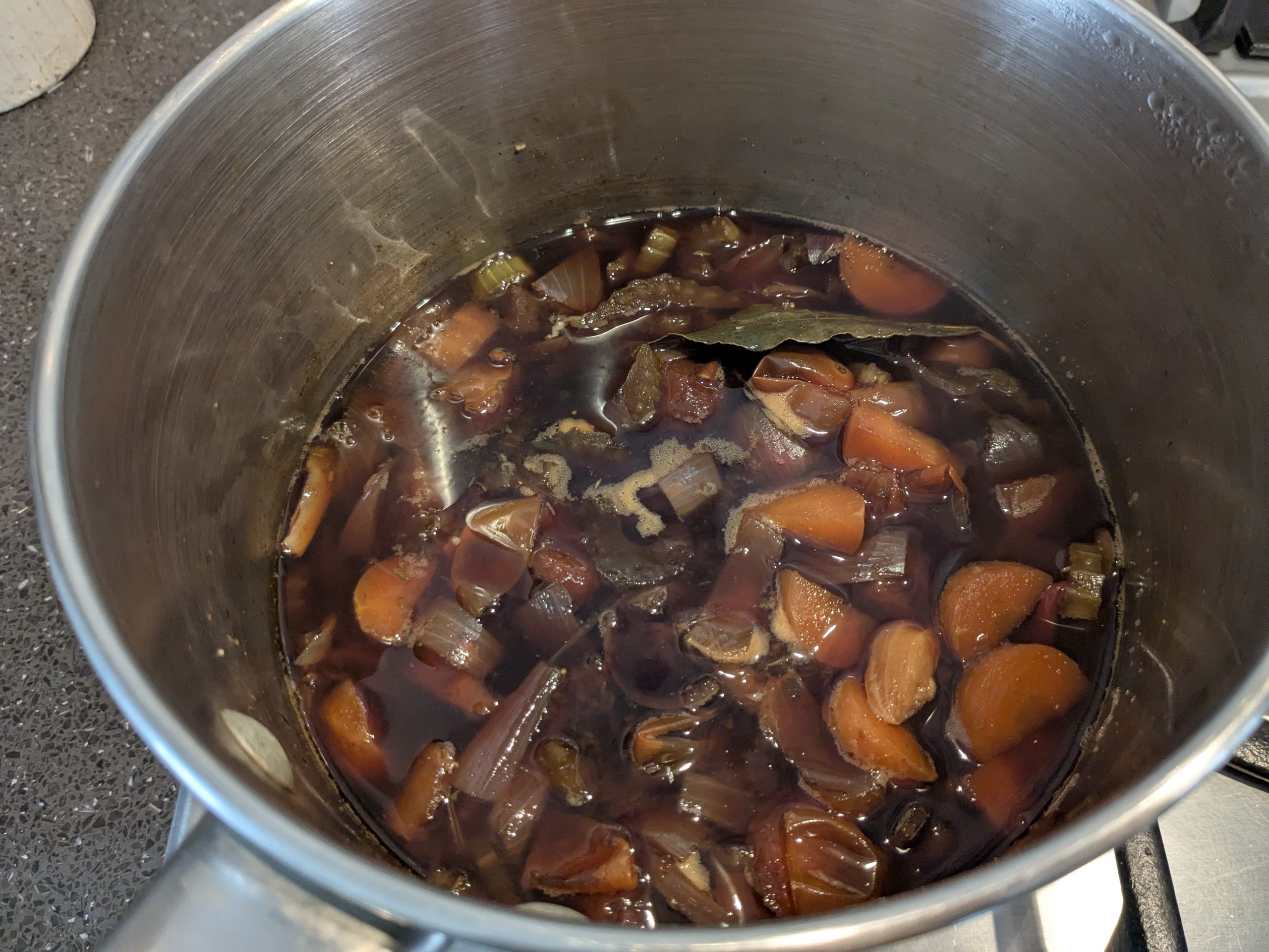ウスターソース分をすくった鍋の中から月桂樹、鷹の爪、クローブ(見つけられれば)を取り除く。